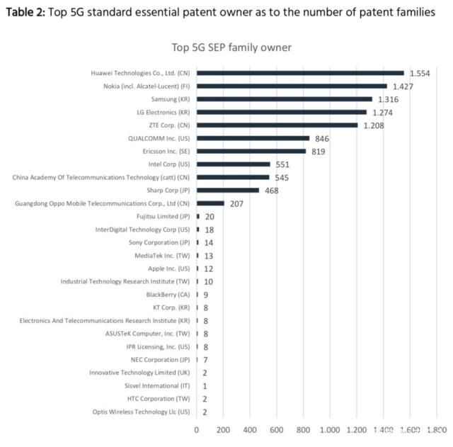 截至2019年4月份,華為擁有1554族5G標準必要專利,位居全球第一!