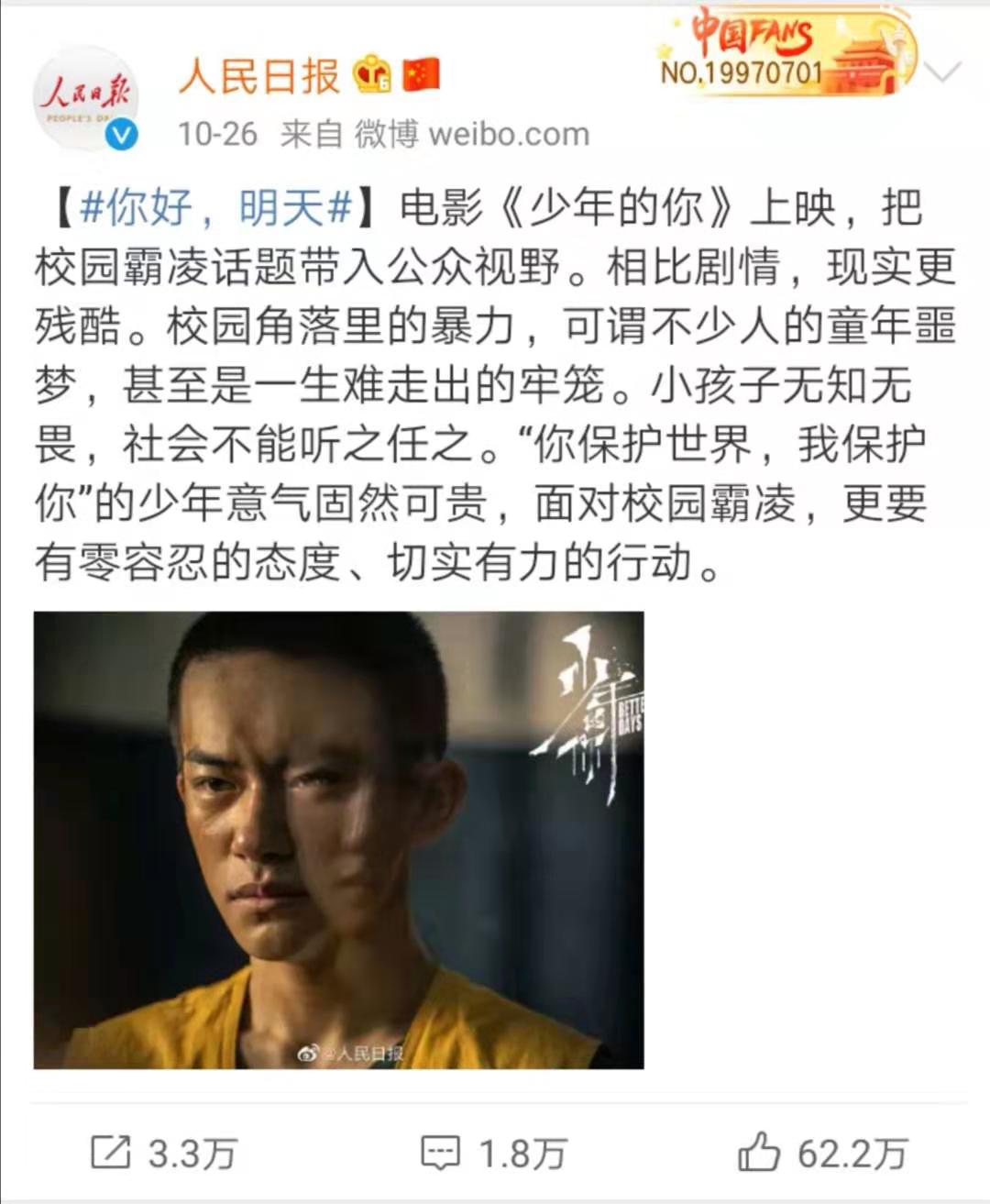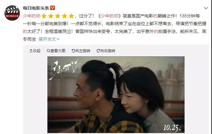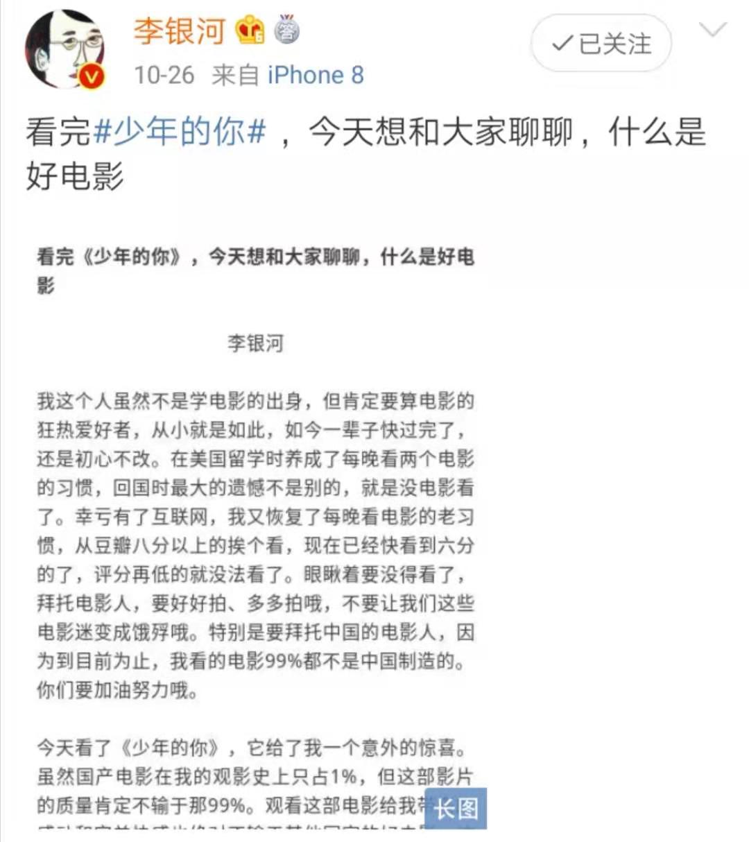 中國著名社會學家李銀河在微博中發長文點贊,稱“不看《少年的你》,就錯過一次美好的審美體驗,就不會知道中國電影現在已經好到什么程度。”