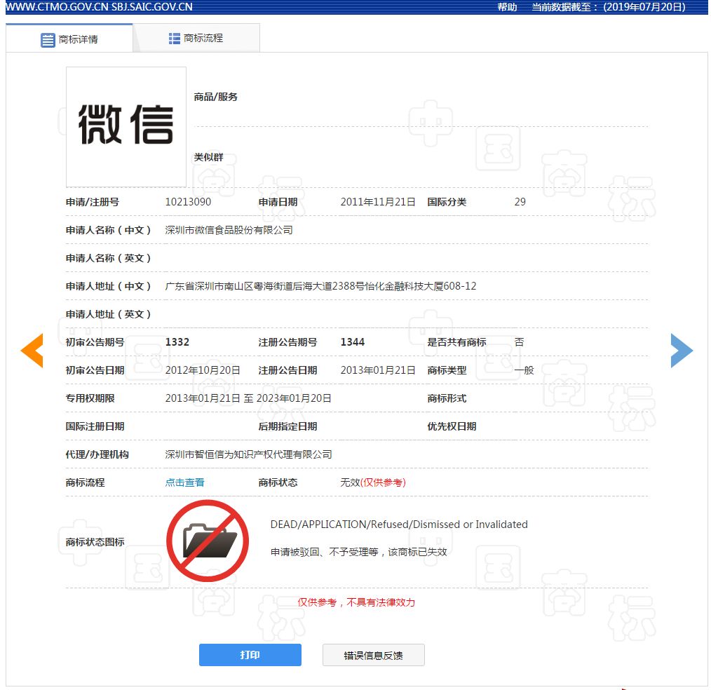 2011年1月21日微信1.0測試版發布,三天后,騰訊公司正式向商標局提交了“微信”圖文商標注冊申請。在這之前和在這之后,“微信”紛紛被他人注冊商標,于是“微信”商標也成為騰訊的痛,時至今日,流浪在外的“微信”商標仍不在少數: