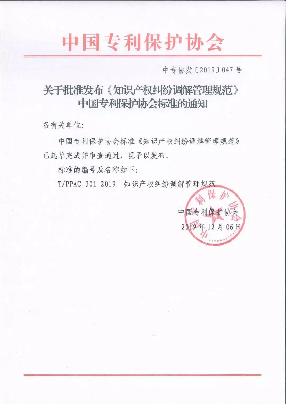 附件:1.關于批準發布《知識產權糾紛調解管理規范》中國專利保護協會標準的通知
